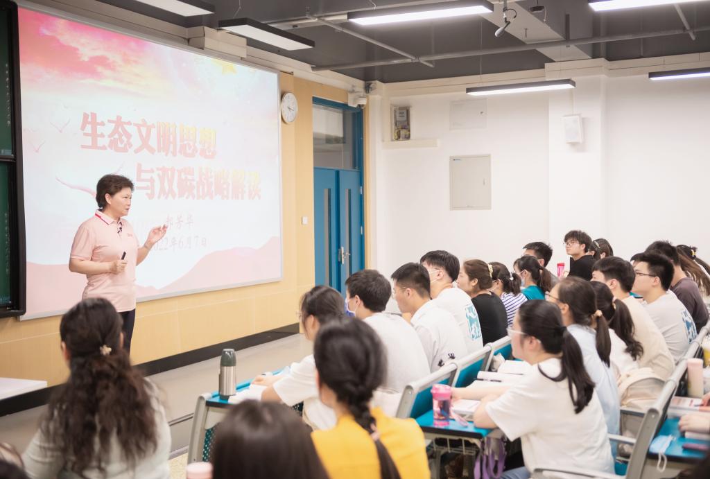 围绕《生态文明思想与双碳战略解读》的主题,郝芳华详细介绍了习近平生态文明思想的发展历程、主要内涵、重大意义、鲜明特色,同时深刻解读了双碳目标的战略意义、现实挑战、实践路径、热点趋势,并为现场同学解答了学习生活和未来工作的疑惑。