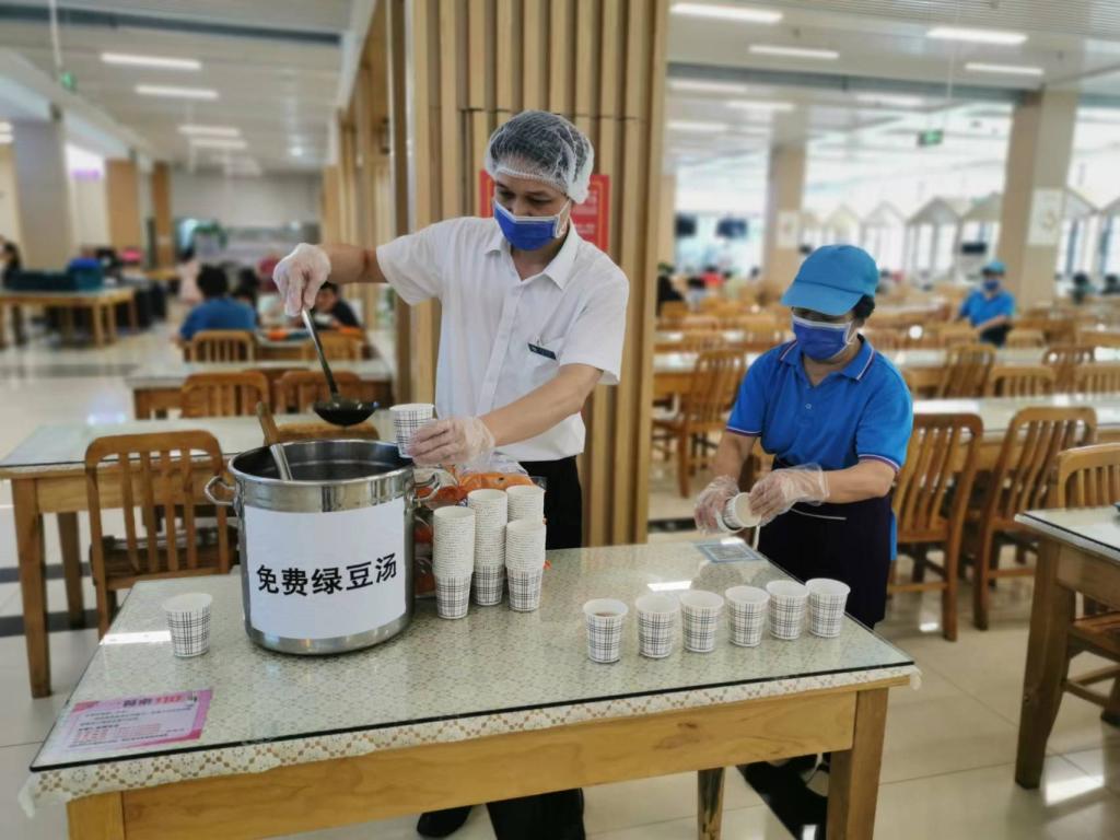 饮食服务中心相关负责人表示,军训期间保证免费绿豆汤供应充足。天气炎热,饮食服务中心会加强食材保鲜储存,提供可口的饭菜和优质的服务,为学校军训提供强有力的餐饮保障。