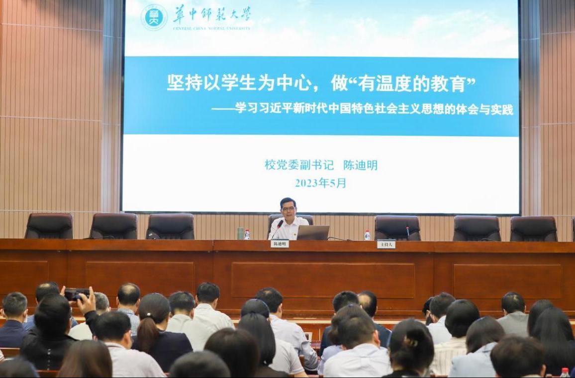 华大在线讯(通讯员 洪满春)5月25日,我校学习贯彻习近平新时代中国特色社会主义思想主题教育专题党课在科学会堂一楼报告厅举行。校党委副书记陈迪明以“坚持以学生为中心,做‘有温度的教育’”为题,为各培养单位分管学生工作负责人、专兼职辅导员以及学工部、团委干部职员讲授专题党课。