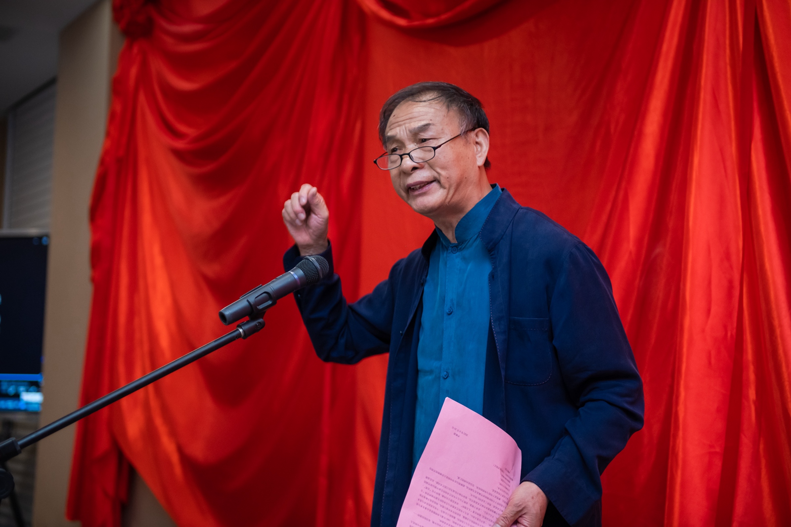 中国冰竹画艺术创始人、华中师范大学硕士生导师尹维新教授讲话。他谈到,作为一名华师退休教师受邀出席仪式,且冰竹画作品有幸成为我校新博物馆首展同步展出,他十分感激和荣幸。他讲述了自己在母校湖北美术学院和华师学习与工作的经历,并表示华中师范大学深厚的人文底蕴、良好的学术环境与良好的教风学风促进了他在艺术道路上不断地开拓进取、守正创新、不忘初心。谨以本次冰竹画展作品感谢母校华师的培养。他将“艺海无涯苦作舟,只管耕耘不问收,借来古今壮我胆,披荆斩棘到晚秋”,在艺术的道路上长耕不辍。